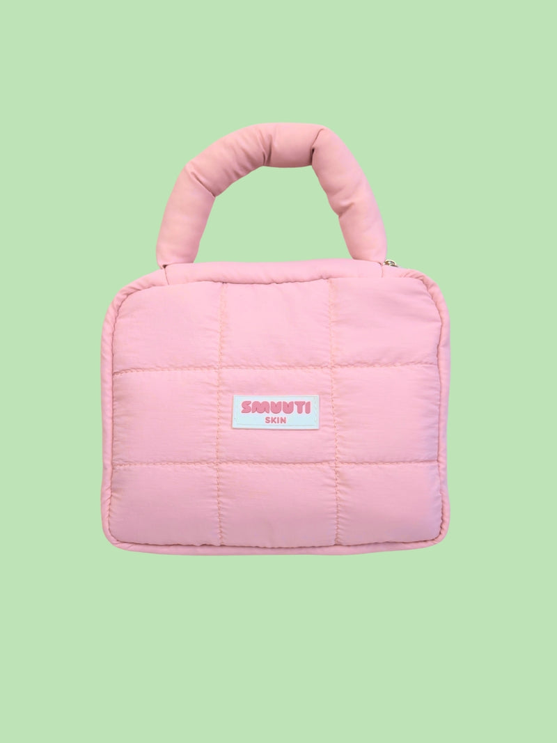 A cute, puffy beauty bag in a pastel pink hue that fits all of your Smuuti Skin products. Opens flat on a surface for easy access to your products. Inside, it has plenty of clear pockets for smaller items like hairbands or lip products.